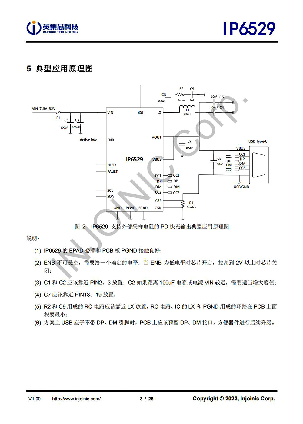 英集芯IP6529是一款应用于车载充电方案的45W大功率车规级快充SOC芯片,该芯片严格遵循AEC-Q100 Grade 2标准的车规级芯片,在-40℃至+105℃的极端温度范围内仍能稳定输出。采用同步降压架构,专为快充应用设计,支持多种快充协议,输出功率达45W。输入电压范围7.3V至32V,输出电压范围3V至21V。满足多种设备充电需求。内置功率MOS管,支持同步整流,减少外部元件数量,简化电路设计。采用QFN24封装,体积小巧。为车载USB Type-C PD充电器提供完整的解决方案。